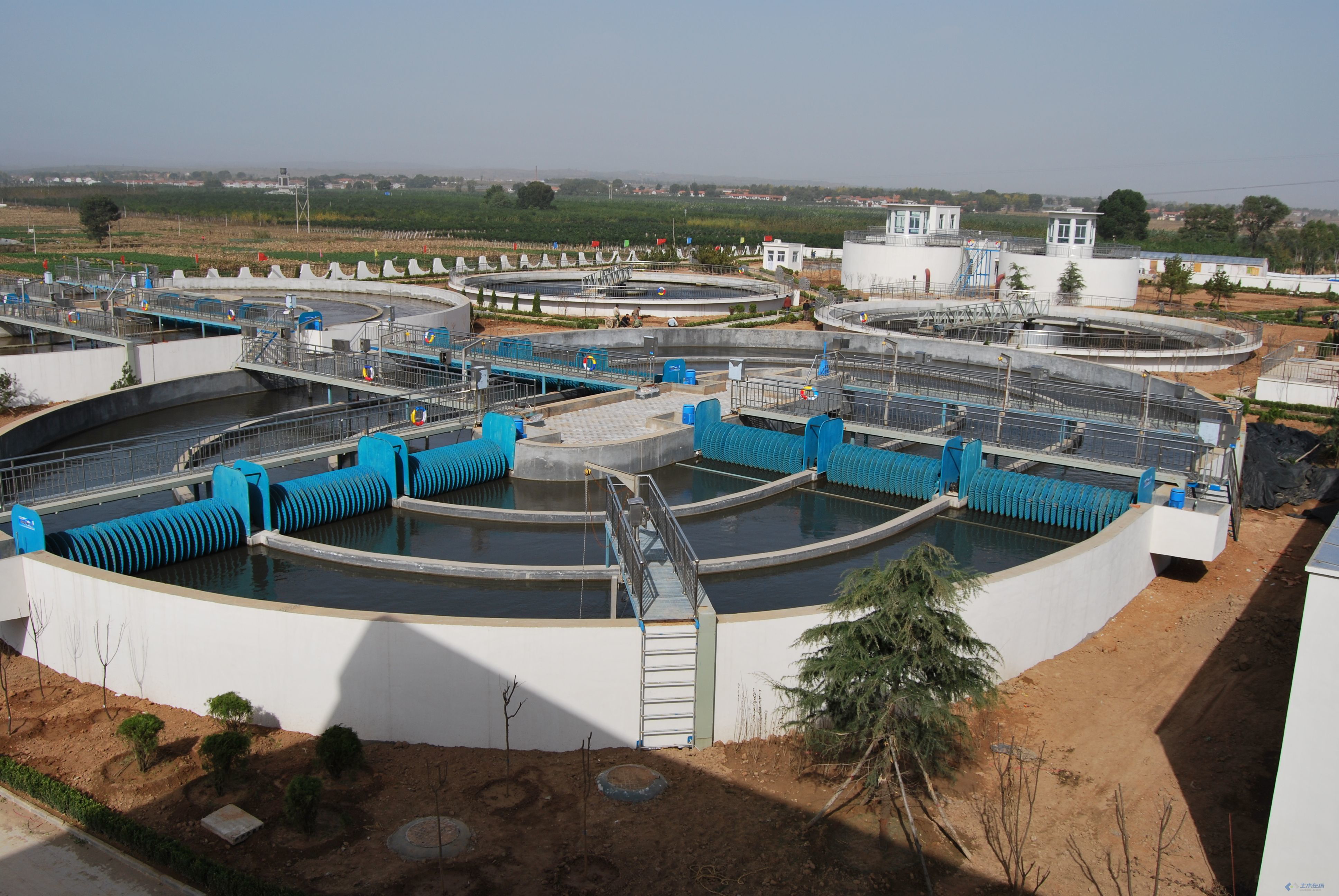 一般在氧化溝轉(zhuǎn)折處設(shè)置導(dǎo)流墻,使水流平穩(wěn)轉(zhuǎn)彎并維持一定流速。由于氧化溝中分隔內(nèi)側(cè)溝的弧度半徑變化較快,其阻力系數(shù)也較高,為了平衡各分隔彎道間的流量,導(dǎo)流板可在彎道內(nèi)偏置。導(dǎo)流墻應(yīng)設(shè)于偏向彎道的內(nèi)側(cè),以使較多的水流向內(nèi)匯集,避免彎道出口靠中心隔墻一側(cè)流速過低,造成回水,引起污泥下沉。設(shè)置導(dǎo)流墻則有利于水流平穩(wěn)轉(zhuǎn)彎,減少回水產(chǎn)生。